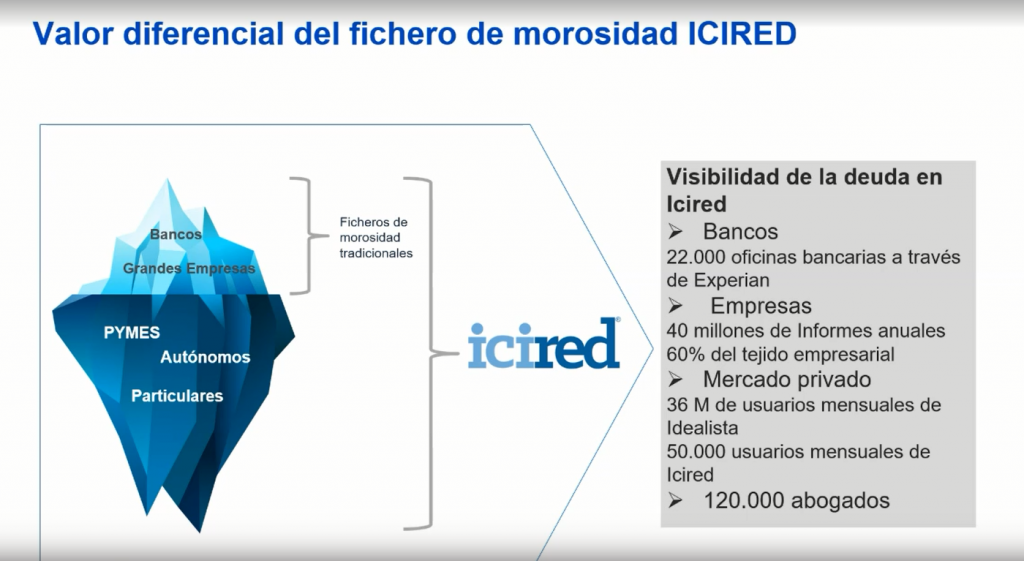 ICIRED INVERSIONES COLECTIVAS EN RED S.L. fue creada en el año 2013 por el abogado granadino José Enrique Rodríguez Zarza. Más adelante se unió al proyecto la multinacional japonesa NTT Data a través de su filial en España everis. En mayo de 2019, la startup andaluza consolidó su innovador modelo de negocio, basado en la economía colaborativa y en el uso del Big Data, tras sellar una alianza estratégica con la mercantil estatal Informa D&B (compañía filial de Grupo CESCE), líder en España en el suministro de Información mercantil, comercial y Financiera. Ambos socios ratificaron su entrada en el capital social de Icired, aportando 2,4 millones de euros entre los dos para adquirir cada uno el 30 % de la compañía dedicada a reclamar impagados on line. En 2020 ICIRED firmó una alianza estratégica con Experian situándose a la vanguardia en la reclamación y consulta de impagos, con el primer y único fichero online de solvencia negativa creado para reclamar, cobrar y publicar impagos con una base de datos conectada al sistema financiero español de crédito. La principal novedad es que incluye deuda no financiera en una web abierta y accesible a cualquier persona física, PYME o autónomo, que quiera usar sus servicios. Esto supone la democratización y revolución de los ficheros de morosidad y sistemas de información de riesgo crediticio. ICIRED cuenta, además, con un acuerdo de colaboración con la base de datos de morosos del idealista (BDMI), asi como el Consejo Andaluz de Colegios de Administradores de Fincas (CAFINCAS).