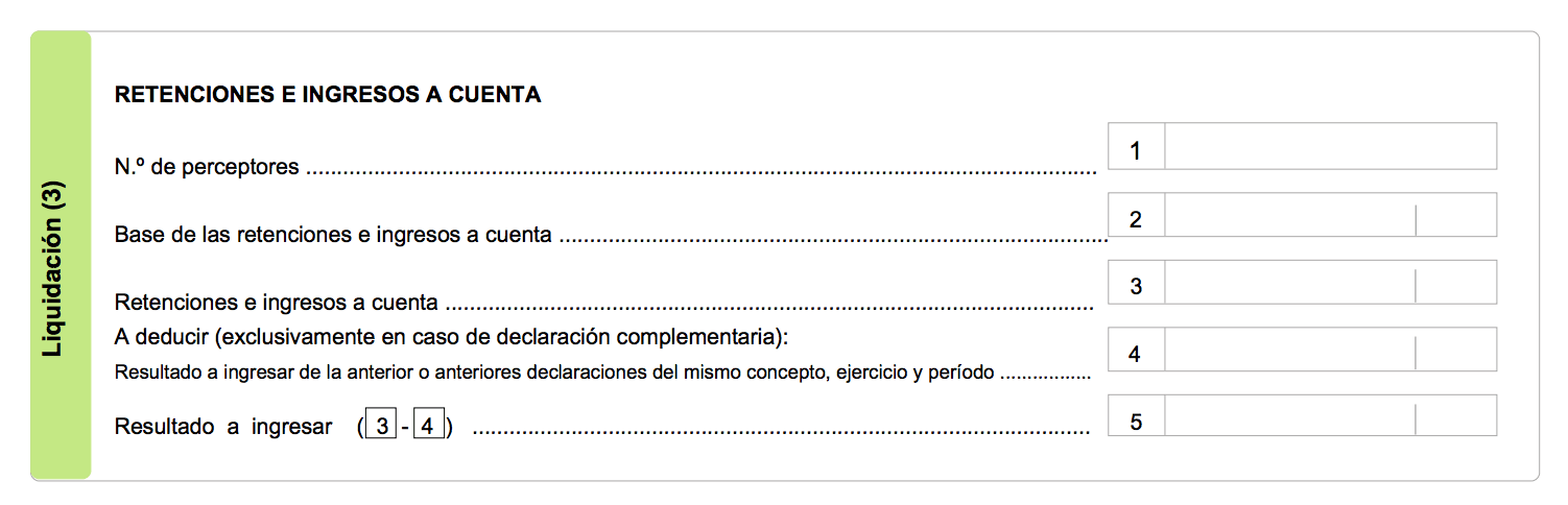 El apartado de liquidación del modelo 115 hace referencia de las retenciones y los ingresos en cuenta en concepto de alquileres IRPF. En cada una de las cinco casillas debemos indicar un dato. Veámoslos: